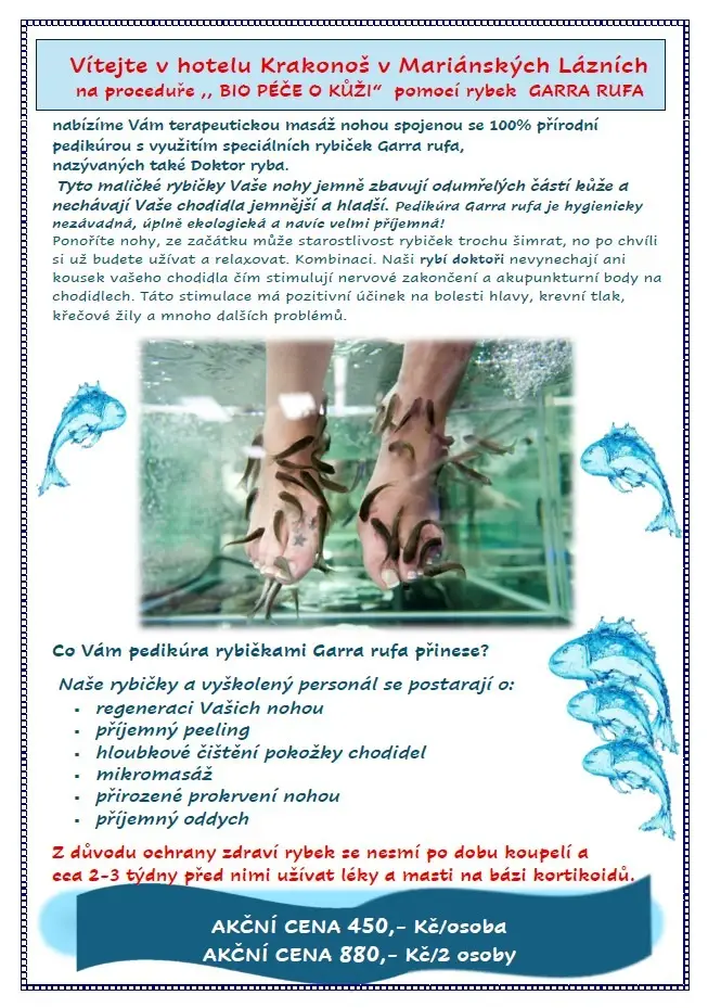 Technika těchto rybiček je na bázi peelingu tzn., že odumřelou kůži požírají a následně vypouští z tlamičky významný enzym ditranol, kterého obsah dosud není znám, ale pokožku uklidňuje, zároveň ji hojí a novou zdravou kůži dokonale zacelí a svojí jedinečnou technikou obrousí. Tyto rybičky nemají zoubky, proto je tato léčebná metoda velice zdárně s výbornými výsledky používána takřka bez omezení věkového průměru. Dále umí manikúru, pedikúru, zarostlé nehty aj.